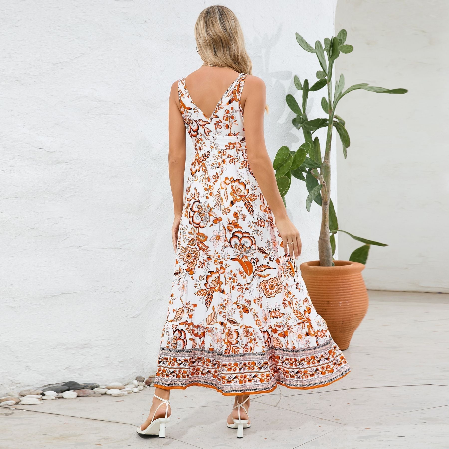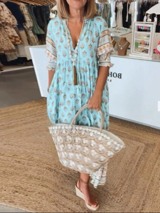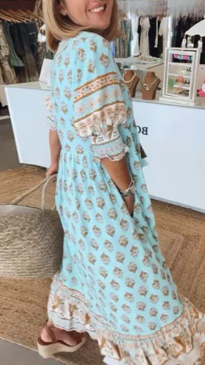 Adoptez une élégance décontractée avec cette magnifique robe longue bohème, parfaite pour vos voyages d'été ou vos balades en ville. Cette robe intemporelle allie confort et style dans un design chic qui vous accompagnera en toutes occasions.